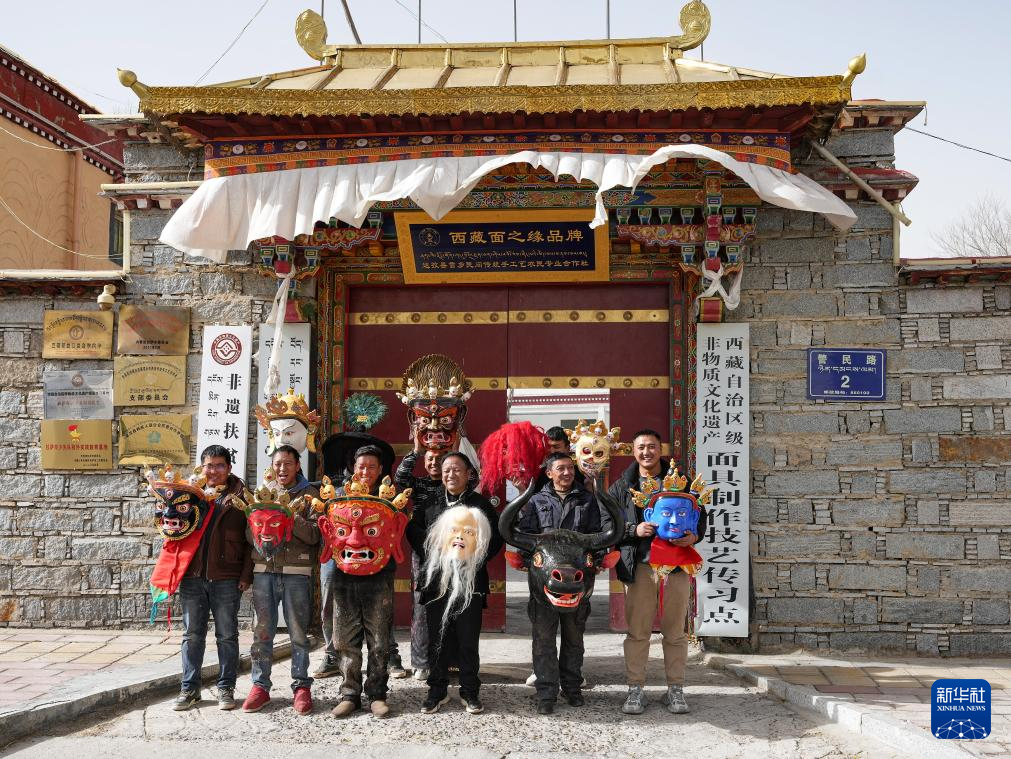 12月9日,拉薩達孜區(qū)雪鄉(xiāng)民間傳統(tǒng)手工藝農民專業(yè)合作社的面具制作工匠們在合作社門口合影。新華社記者 晉美多吉 攝