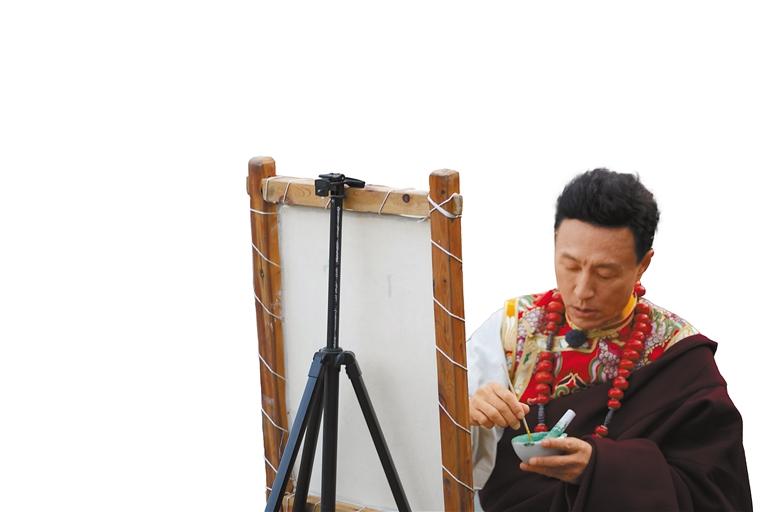 中央廣播電視總臺(tái)“乘著大巴看中國(guó)·西藏行”的嘉賓在嘎瑪鄉(xiāng)體驗(yàn)唐卡繪畫。記者 貢秋曲措 攝