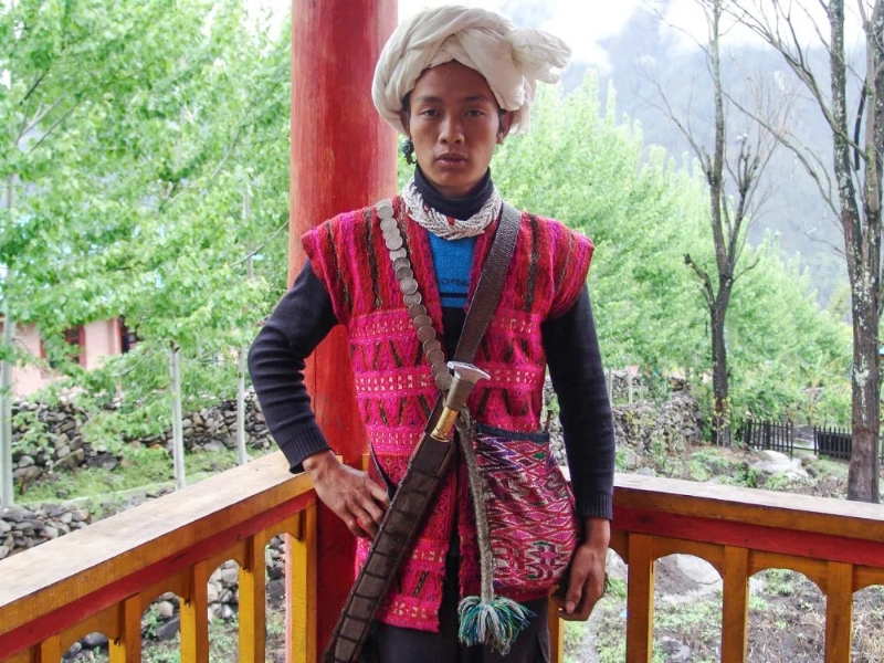 僜人服飾分男裝和女裝。男子上身一般穿無領(lǐng)無袖長衫,多為白色和黑色,他們一般用布條纏繞頭部;僜家女性上衣一般織有彩紋,短及胸部,腰部袒露,下著筒裙,筒裙多用彩格布制作。男女均習慣用大披肩和挎包。