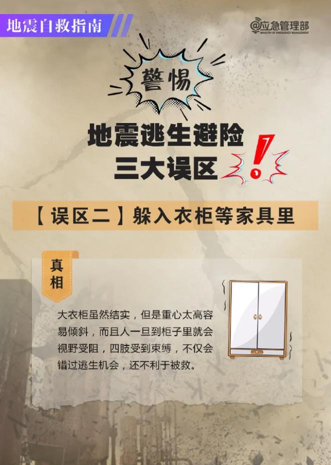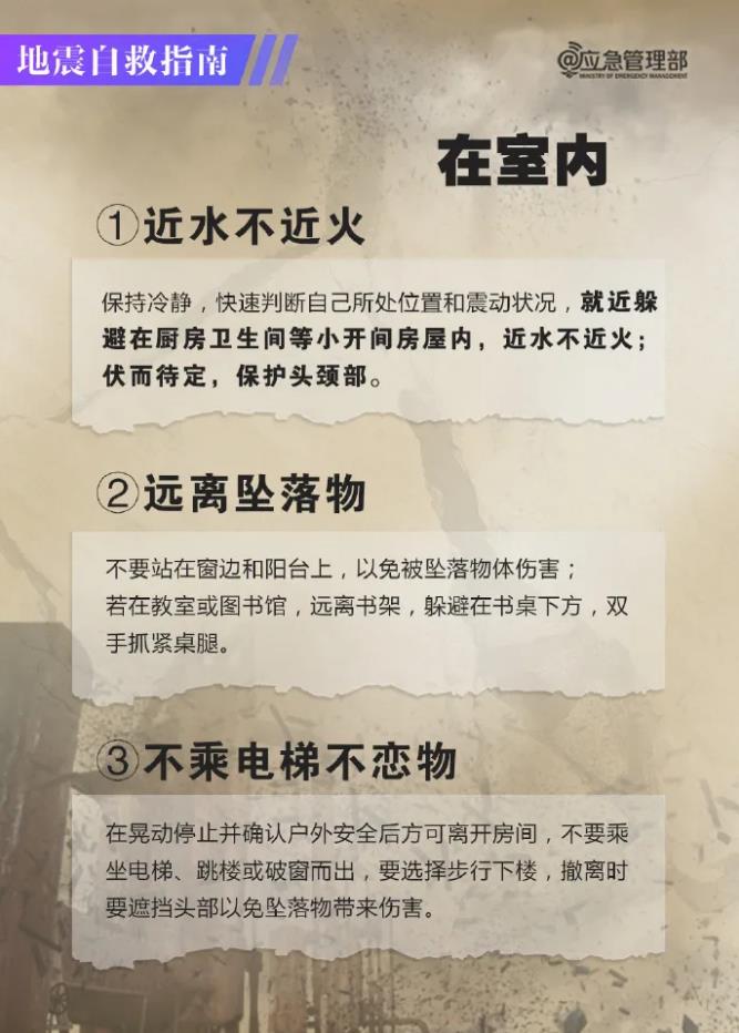 我們要遠(yuǎn)離主墻面、門窗和有高大家具的地方,迅速到衛(wèi)生間、廚房等小開(kāi)間房間躲避,等晃動(dòng)停止后,再沿消防通道有序疏散,以防后續(xù)余震的影響。疏散時(shí)禁止乘坐電梯,也不提倡在有地震的時(shí)候,利用繩索逃生。