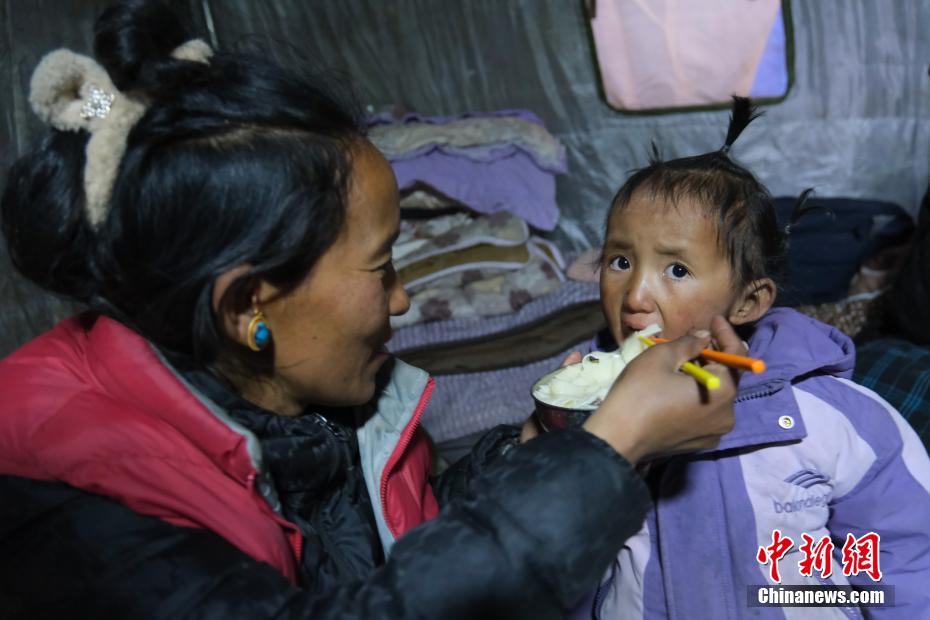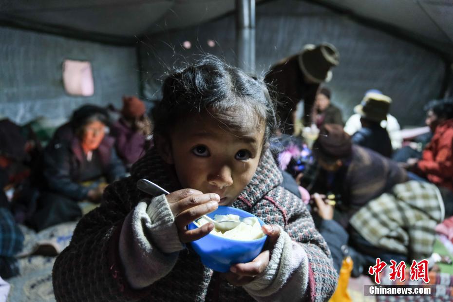 1月7日9時5分,西藏自治區(qū)日喀則市定日縣措果鄉(xiāng)附近(東經87.45度,北緯28.50度)發(fā)生6.8級地震。日喀則市官方介紹,經初步排查,截至當日15時,地震共造成95人遇難,130人受傷,房屋損毀正在統(tǒng)計中。圖為日喀則拉孜縣境內的村民在臨時搭建的帳篷里吃飯。中新社記者 江飛波 攝