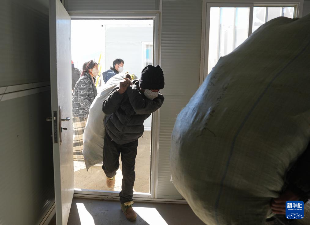 1月10日,在定日縣長所鄉(xiāng)古榮村,受災群眾將過冬物資從臨時安置帳篷搬入板房。新華社記者 沈伯韓 攝