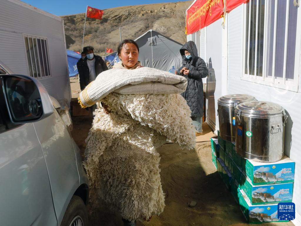 1月10日,在定日縣長所鄉(xiāng)古榮村,受災群眾將領取到的過冬物資搬入板房。新華社記者 沈伯韓 攝