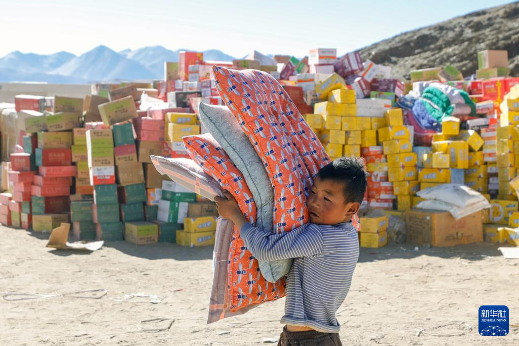 1月10日,在定日縣長所鄉(xiāng)古榮村,一名男孩抱著領取到的過冬物資,從臨時安置帳篷搬入板房。新華社記者 沈伯韓 攝