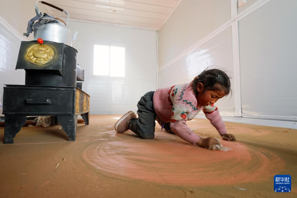 1月10日,在定日縣長所鄉(xiāng)古榮村,兩名小朋友在板房內(nèi)玩耍。新華社記者 沈伯韓 攝