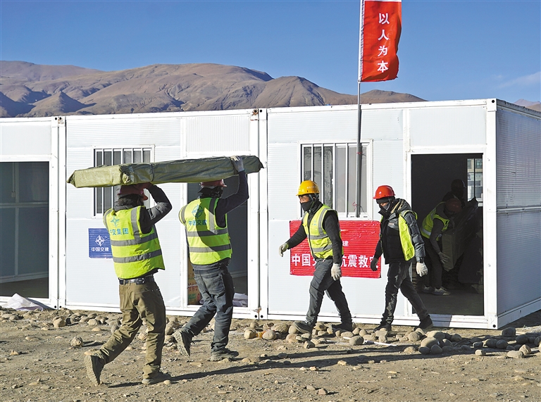 圖為1月10日,中交集團二航局二公司工作人員在拉孜縣為受災群眾組裝活動板房。記者 薛瑩 王香香 索朗群培 攝