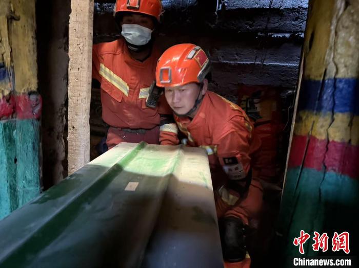 圖為日喀則市森林消防救援大隊隊員在受損房屋內(nèi)搜尋受災(zāi)村民財產(chǎn)。米瑪次仁 攝
