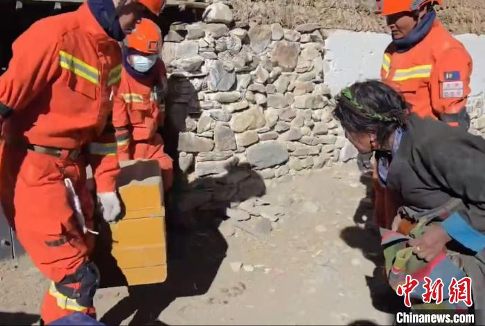 圖為日喀則市森林消防大隊隊員將受損房屋內(nèi)搜尋到的財物交付受災(zāi)村民手中。米瑪次仁 攝