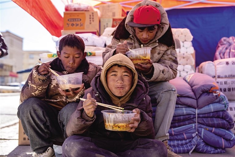在長所鄉(xiāng)森嘎村安置點,來自定日縣崗嘎鎮(zhèn)的普桑和其他3名村民正在給受災(zāi)群眾與救援人員分發(fā)“巴突”(藏語音譯,意為面疙瘩)?!敖裉焐衔缥覀冏龅摹畯姎w’(藏語音譯,意為煮青稞酒和糌粑),中午做的‘巴突’,這是我們的傳統(tǒng)美食,吃了全身都會暖乎乎的。大家互幫互助,一切都會慢慢好起來的。”普桑說。