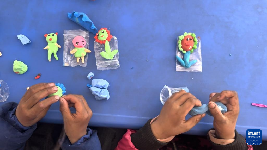 1月13日中午,在定日縣曲洛鄉(xiāng)措娃村安置點的兒童友好空間,孩子們在社工指導下捏塑超輕黏土。新華社記者索朗德吉 攝
