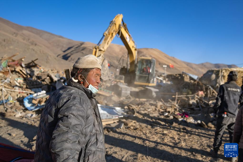 1月13日,在定日縣長所鄉(xiāng)古榮村,次仁扎西老人站在自家的廢墟前。新華社記者 丁增尼達(dá) 攝