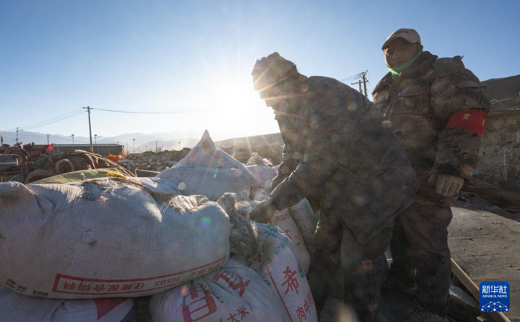 1月13日,在定日縣長所鄉(xiāng)古榮村,定日縣民兵在搬運青稞。新華社記者 丁增尼達(dá) 攝