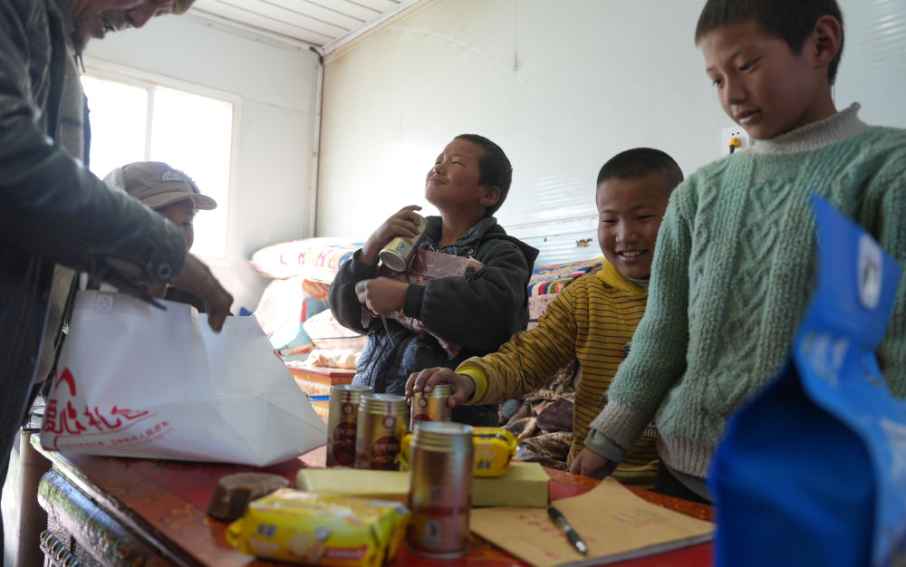 1月27日,加嘎村安置點(diǎn)受災(zāi)群眾在領(lǐng)取新年大禮包。新華社記者 晉美多吉 攝
