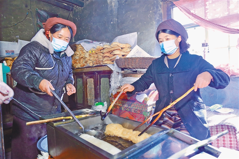 旦索朗一家,在每年藏歷新年前夕,都會(huì)開啟一年中最為繁忙的時(shí)光——經(jīng)營(yíng)“卡賽”生意。旦索朗回憶往昔,感慨萬(wàn)千:“小時(shí)候過年,炸‘卡賽’是家家戶戶的頭等大事,整個(gè)村子都彌漫著誘人的香氣,那是新年專屬的味道。如今,時(shí)代在變遷,人們的生活方式也發(fā)生了改變,越來越多的人選擇購(gòu)買成品‘卡賽’,這既契合了快節(jié)奏的現(xiàn)代生活,也為我們提供了發(fā)展的機(jī)遇。我們經(jīng)營(yíng)‘卡賽’生意已有6年,這期間,靠著誠(chéng)信經(jīng)營(yíng)和對(duì)高品質(zhì)的堅(jiān)守,生意蒸蒸日上,還帶動(dòng)了6名村民共同增收,大家一起用雙手創(chuàng)造美好生活?!?/p>