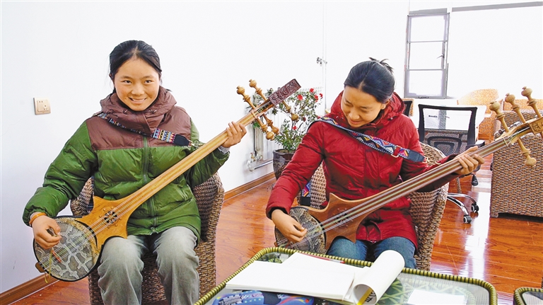 大學(xué)生志愿者在演示六弦琴?gòu)椬?。通訊員 王利軍 攝