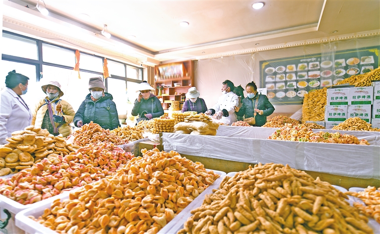 隨著藏歷新年日益臨近,拉薩街頭巷尾各種琳瑯滿目的“藏式”年貨,讓年味兒越來越濃,而構(gòu)成這年味兒最重要的元素之一就是“卡賽”的香味兒?!翱ㄙ悺笔且环N油炸面食,是藏歷新年必不可少的食物。藏歷新年前夕,古城拉薩各個加工銷售“卡賽”的店鋪飄出陣陣香味。