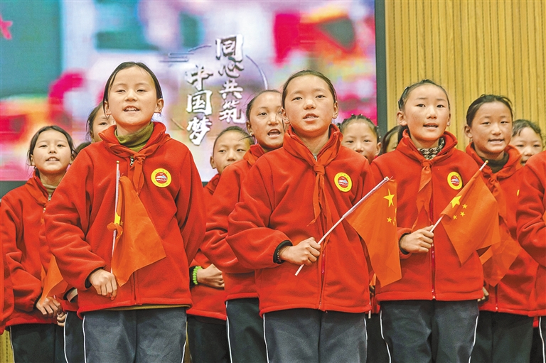 圖為3月5日,來自受災(zāi)最嚴(yán)重的定日縣長所鄉(xiāng)、措果鄉(xiāng)、曲洛鄉(xiāng)的3所小學(xué)的學(xué)生在開學(xué)典禮上演唱歌曲《同心共筑中國夢》。新華社記者 姜帆 攝