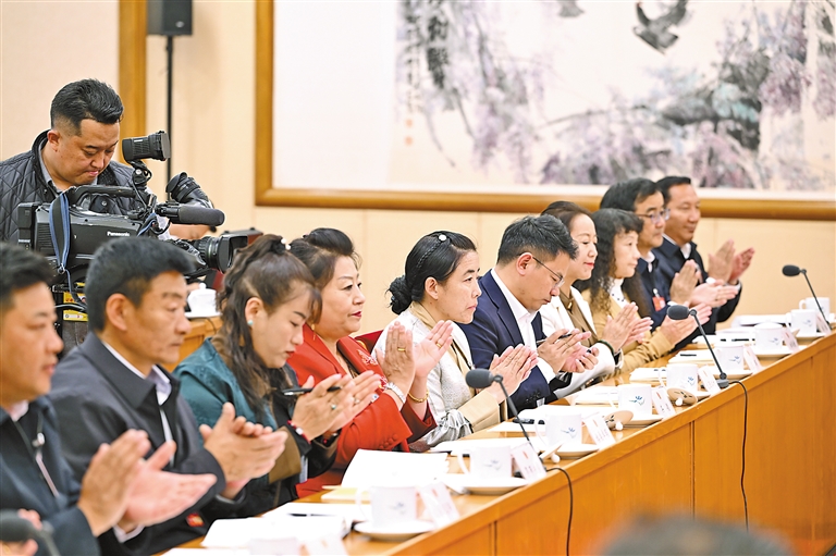 西藏全國(guó)人大代表在西藏代表團(tuán)全體會(huì)議上鼓掌通過(guò)各項(xiàng)決議草案。