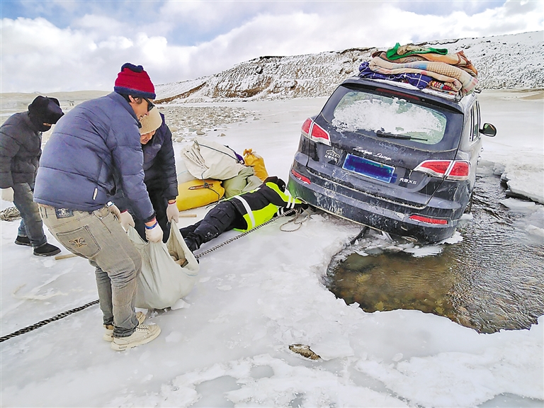 2月16日,聶榮縣公安局桑榮鄉(xiāng)派出所接到轄區(qū)群眾報警求助,稱其在前往冬季牧場途中,車輛不慎陷入結(jié)冰河道,無法自行脫困。接警后,派出所立即組織警力攜帶救援工具第一時間趕到現(xiàn)場,只見,被困車輛右側(cè)輪胎陷入冰層,動彈不得。對此,民(輔)警迅速采取救援措施,冒著嚴寒使用鐵鍬鑿開并清理輪胎周圍冰層,俯臥在冰面上,為車輛綁上拖車繩,采取車拉人推等方式,全力幫助車輛脫困。最終,經(jīng)過五個多小時的不懈努力,成功將被困車輛拖拽至安全地帶。