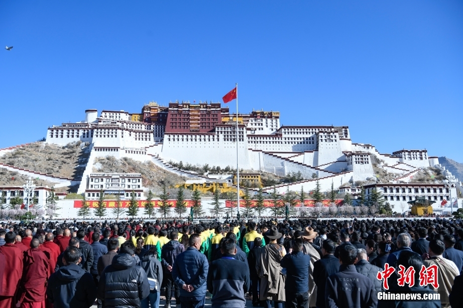 3月28日,西藏各族各界人士聚集在拉薩布達(dá)拉宮廣場(chǎng),升國(guó)旗、唱國(guó)歌,參加西藏百萬(wàn)農(nóng)奴解放66周年紀(jì)念活動(dòng)。圖為升國(guó)旗儀式現(xiàn)場(chǎng)。
