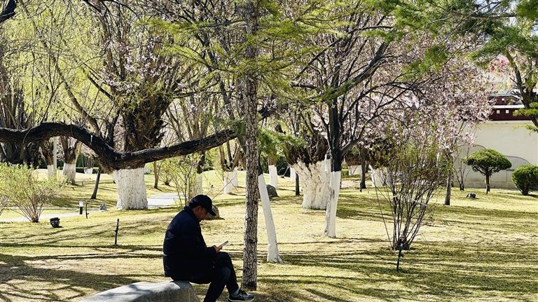 過(guò)了羅布林卡路繼續(xù)往市區(qū)方向,區(qū)直工委路上的紫葉李、櫻花成團(tuán)怒放,來(lái)來(lái)往往的車(chē)輛和行人與這一排排花樹(shù)形成了最具煙火氣的城市美景。漫步街頭,偶有花香飄過(guò),一路走來(lái),花瓣已落肩頭,這就是拉薩送給人們的最好的春日禮物。
