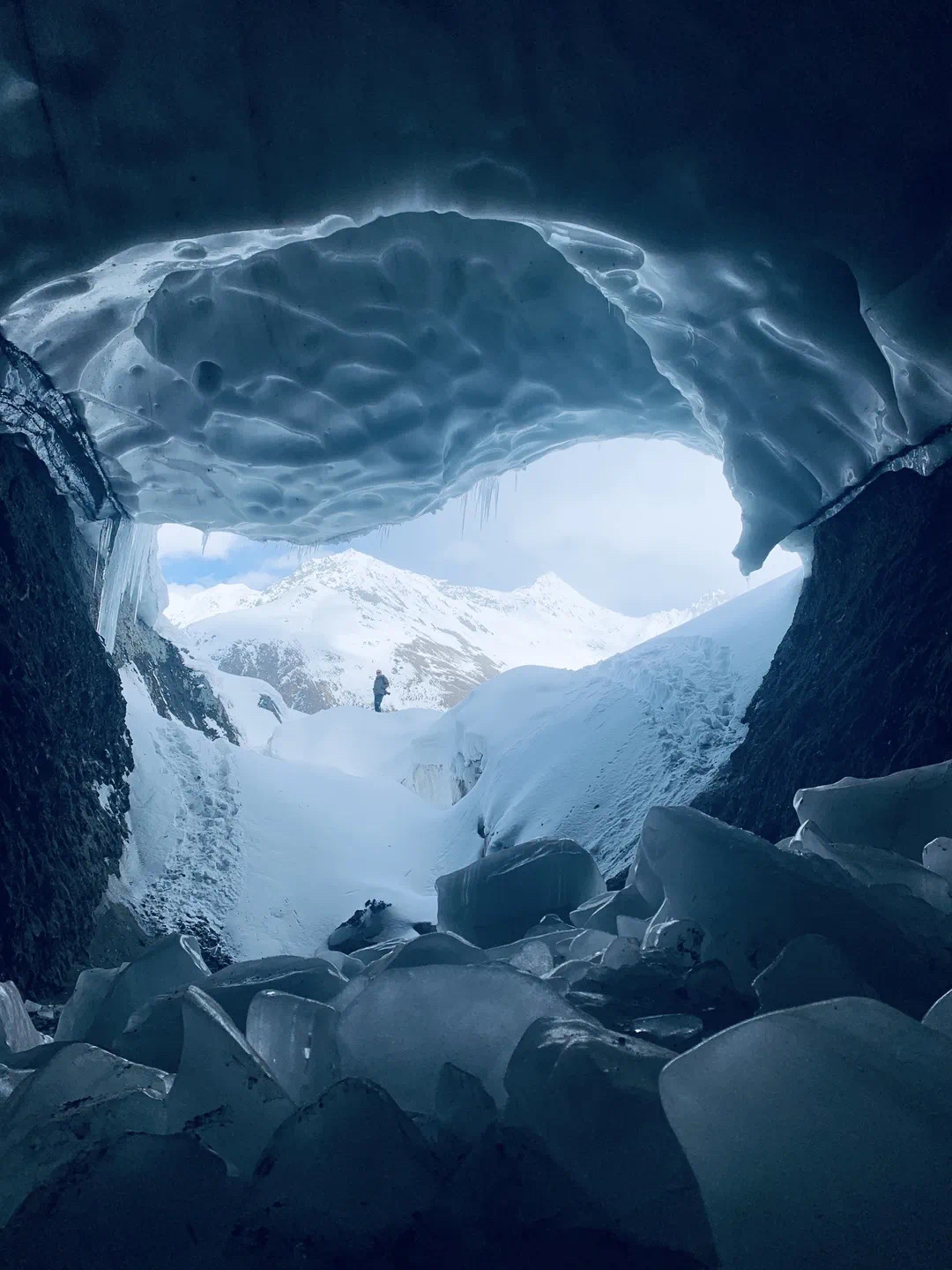 冰洞入口高約1米,需要彎著腰才能進入。待完全進入后,空間逐漸開闊,冰洞內(nèi)別有洞天。冰壁深處透著蔚藍,似是把邊壩的藍天鎖了進去。冰洞最開闊的地方有一處冰臺,游客在那里打卡拍照,記錄下這絕美的風(fēng)光。