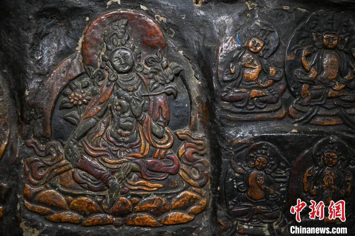 4月27日,記者探訪了當雄縣貢堂鄉(xiāng)沖嘎爾村康馬寺的瑪尼拉康?,斈崂凳窃撍鲁扌卸粗獾脑缙谧诮袒顒訄鏊?,也是寺院里最古老的建筑。這里保存著令人驚嘆的石刻造像墻,這些石刻距今已有三百年歷史?,斈崂低庥^普通,但其室內(nèi)六面墻上整齊地貼滿了浮雕石刻板,共計1213塊(僅一塊缺失)。石刻內(nèi)容豐富,涵蓋了藏傳佛教各宗各派的本尊、祖師、佛母菩薩等,造型多姿多樣,線條清晰流暢。這處石刻造像墻對于研究西藏傳統(tǒng)雕刻、藏傳佛教以及歷史具有重大意義。中新社記者 貢嘎來松 攝