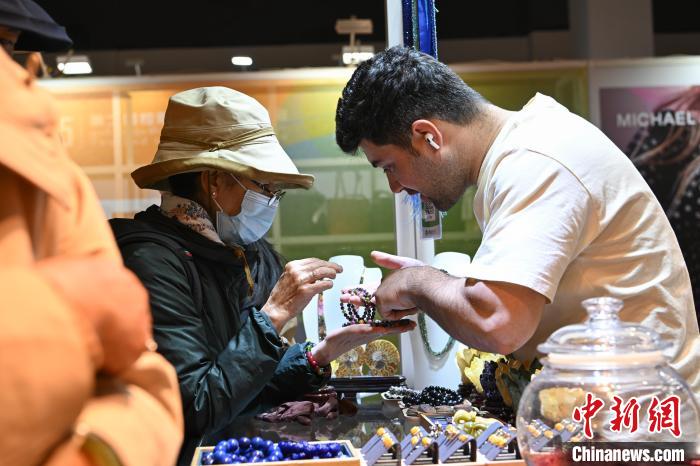 5月16日,2025第二屆拉薩進(jìn)口商品展覽會在西藏會展中心2號館舉行。該展會以“開放新拉薩,共享新機(jī)遇”為主題,吸引了來自30多個(gè)國家和250多家企業(yè)參展,客商總數(shù)為600多人,其中境外及港澳臺地區(qū)人員達(dá)200多人。本屆展會上,展商們帶來了超 1500個(gè)品類、10000余款展品。圖為拉薩進(jìn)口商品展覽會現(xiàn)場,巴基斯坦商人(右)向顧客介紹、推銷自己的商品。中新社記者 貢嘎來松 攝