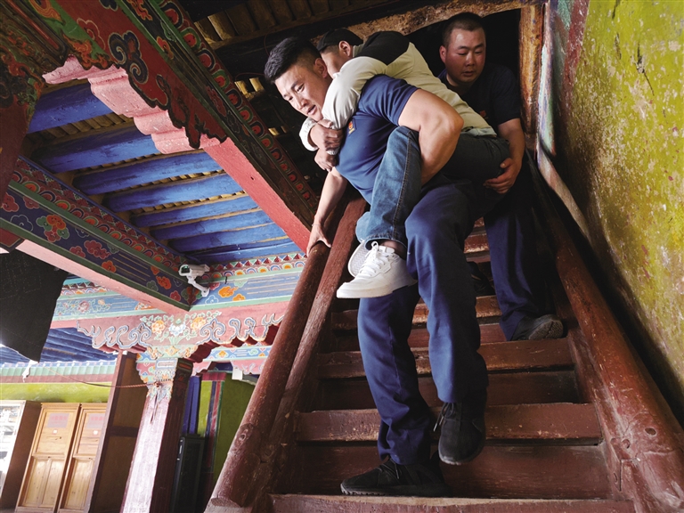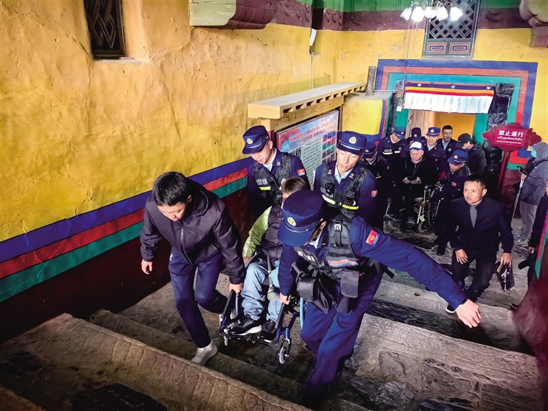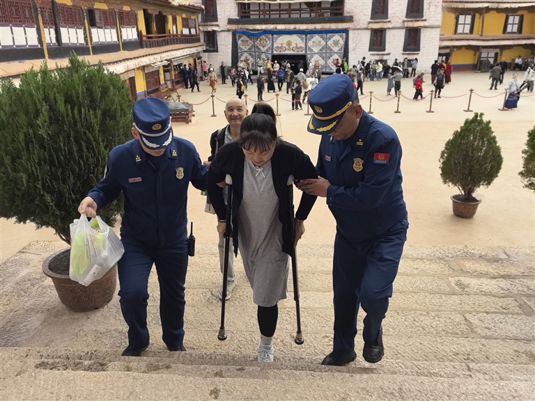 2024年,消防救援站接到一項(xiàng)特殊任務(wù)——幫助19名來(lái)自四川的殘疾人士參觀布達(dá)拉宮。面對(duì)15位肢體殘疾人和4位視力殘疾人,尤其是6位重度輪椅使用者和2位全盲者,消防員們沒有絲毫猶豫接下任務(wù)。布達(dá)拉宮海拔高、樓梯多、內(nèi)部道路狹窄陡峭,消防員們就用擔(dān)架抬、輪流背的方式帶領(lǐng)他們游覽。同時(shí),消防員化身“導(dǎo)游”,每到一處都詳細(xì)講解布達(dá)拉宮的歷史文化,耐心解答疑問(wèn),讓這些特殊游客感受到了溫暖與尊重。