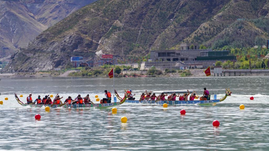 ↑5月31日,在拉薩市濱河公園旁的水域內(nèi),西藏自治區(qū)端午節(jié)牛皮船(龍舟)賽舉行。新華社記者 晉美多吉 攝