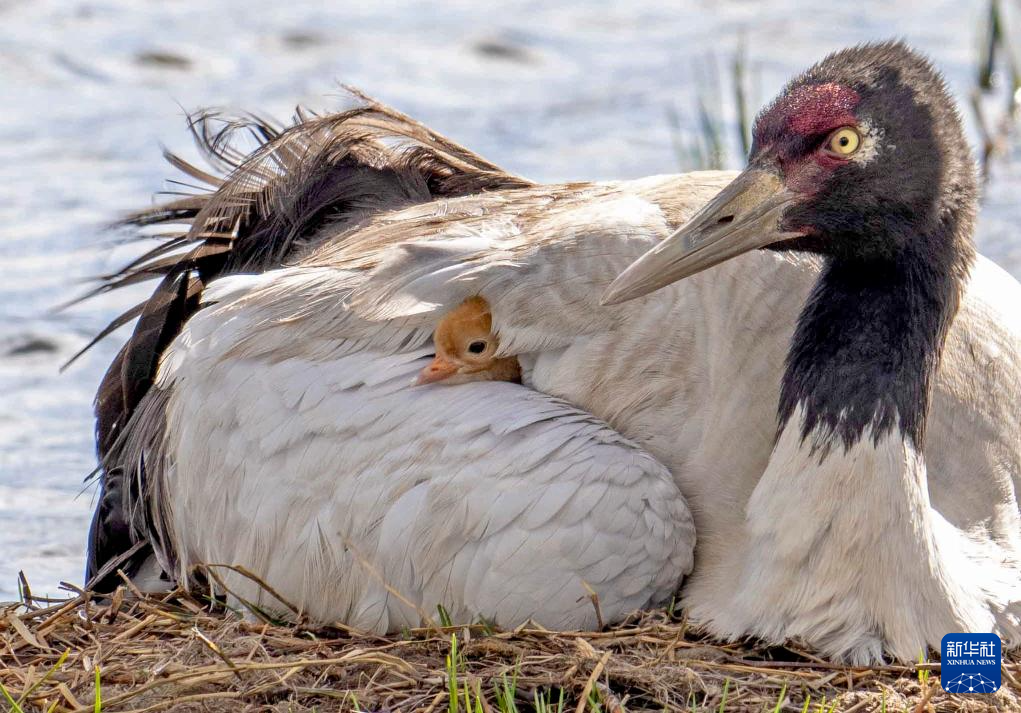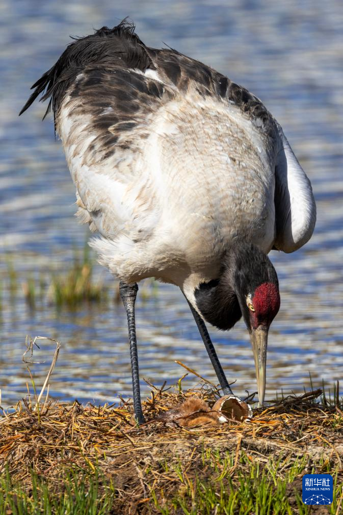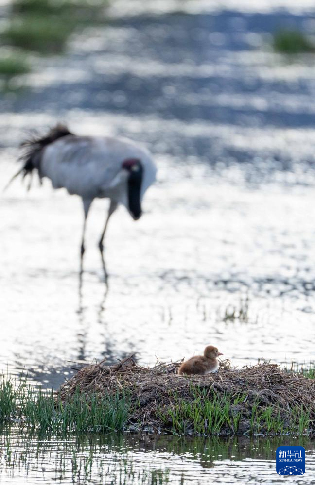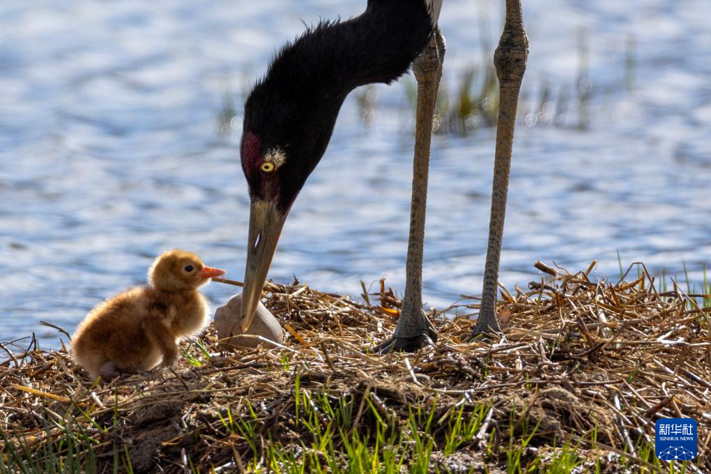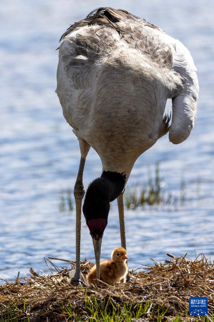 6月4日,在西藏那曲市申扎縣,一只黑頸鶴查看剛出生雛鳥的情況。新華社記者 孫瑞博 攝