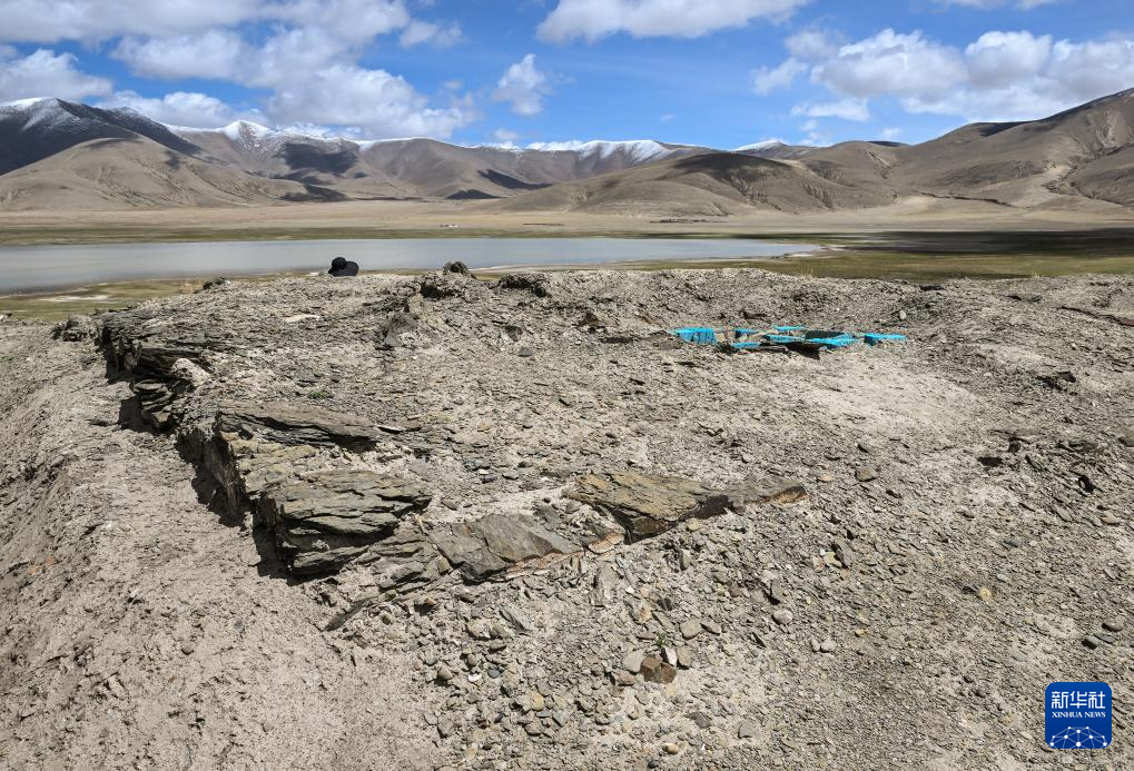 這是5月22日拍攝的坐落在瑪不錯(cuò)湖畔的遺址第四期石構(gòu)地面建筑考古發(fā)掘現(xiàn)場(chǎng)(無(wú)人機(jī)照片)。新華社記者 李賀 攝