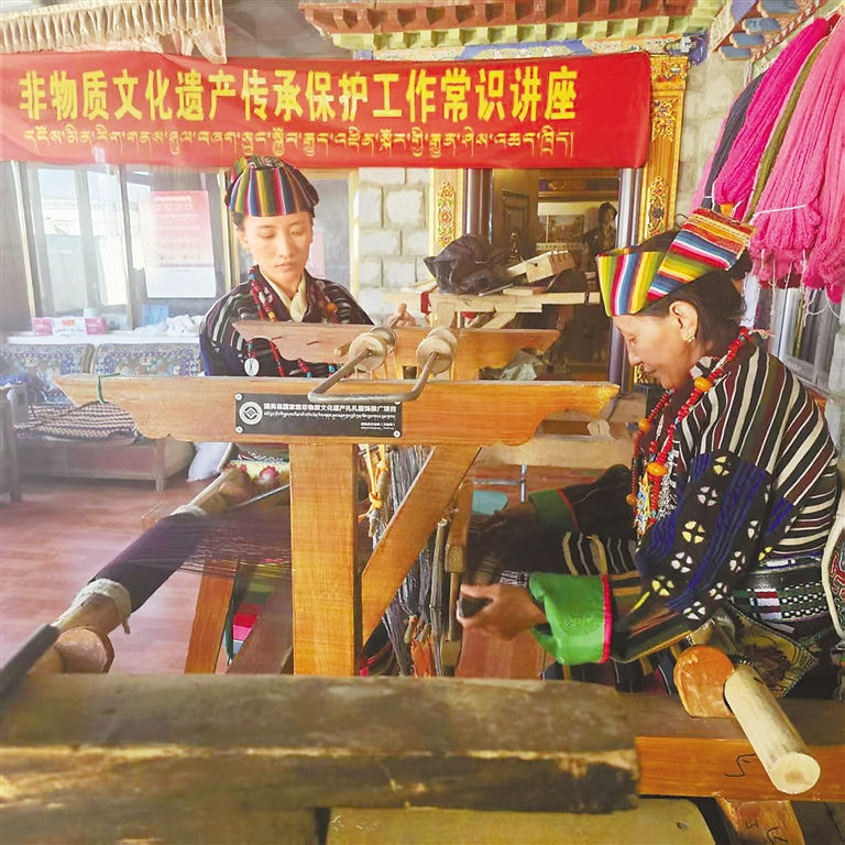 在措美縣非遺展示活動現(xiàn)場,扎雜村村民在演示織氆氌。