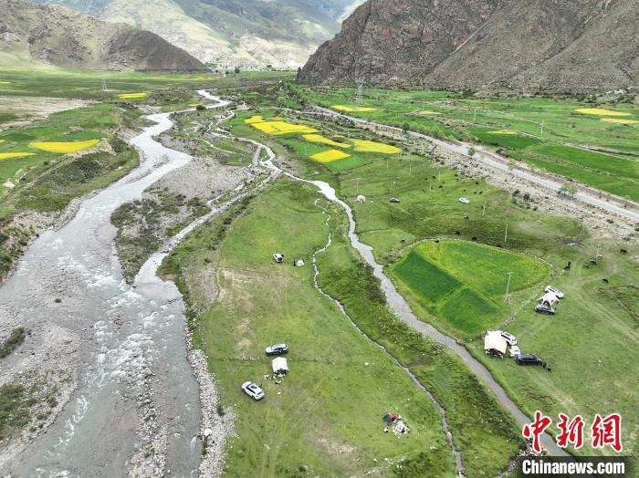 7月5日,西藏拉薩市風(fēng)和日麗,宜人周末里,市民紛紛前往近郊“過林卡”。在堆龍德慶區(qū)古榮鎮(zhèn)楚布溝,帳篷林立,歡聲笑語不斷。人們圍坐野餐,享受美食,伴著高原美景談天歌唱,孩童嬉戲奔跑,在自然中放松身心,延續(xù)傳統(tǒng)休閑樂趣 。圖為市民在楚布溝里“過林卡”。(無人機照片)中新社記者 貢嘎來松 攝