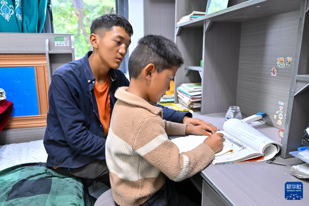 7月21日,17歲的米瑪次仁(左)在新房臥室內(nèi)輔導(dǎo)7歲的弟弟堅阿達瓦寫作業(yè)。新華社記者 李鑫 攝