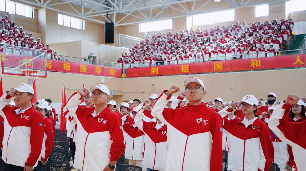 7月29日,2025年大學(xué)生志愿服務(wù)西部計劃服務(wù)西藏專項(xiàng)志愿者出征儀式上,志愿者們正在宣誓。陳梟 攝