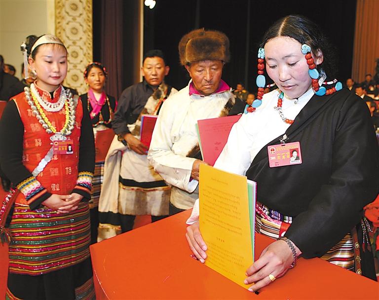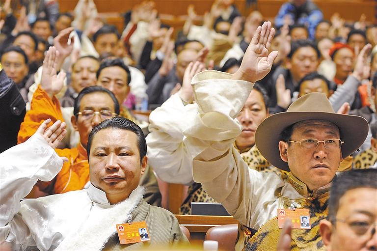 在舊西藏,占總?cè)丝诓坏?%的三大領(lǐng)主(官家、貴族和寺院上層僧侶)占有全部生產(chǎn)資料,而占總?cè)丝?5%以上的農(nóng)奴和奴隸沒有人身自由。西藏民主改革特別是西藏自治區(qū)成立以來,民族區(qū)域自治制度得到堅(jiān)決貫徹,各族人民參與民主政治建設(shè)的熱情持續(xù)高漲:農(nóng)奴的后代當(dāng)選人大代表,通過人民代表大會(huì)制度參與國(guó)家治理;截至目前,全區(qū)四級(jí)人大代表42000余人中,藏族和其他少數(shù)民族約占89%;門巴、珞巴等人口不足萬人的民族,在全國(guó)及西藏人大均有代表——雪域高原各族兒女依法行使民主權(quán)利,真正成為命運(yùn)的主宰者。
