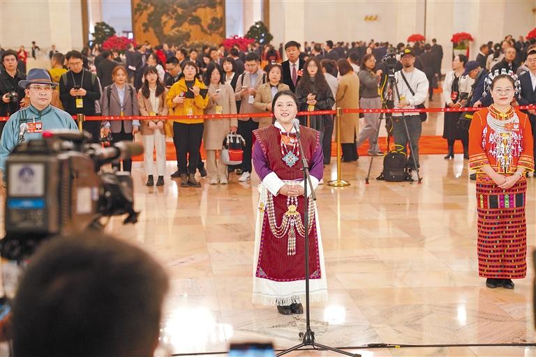 圖為住藏全國(guó)政協(xié)委員白瑪玉珍(中)在“委員通道”上介紹墨脫的發(fā)展變化(2025年3月攝)。