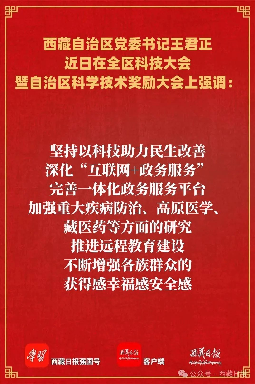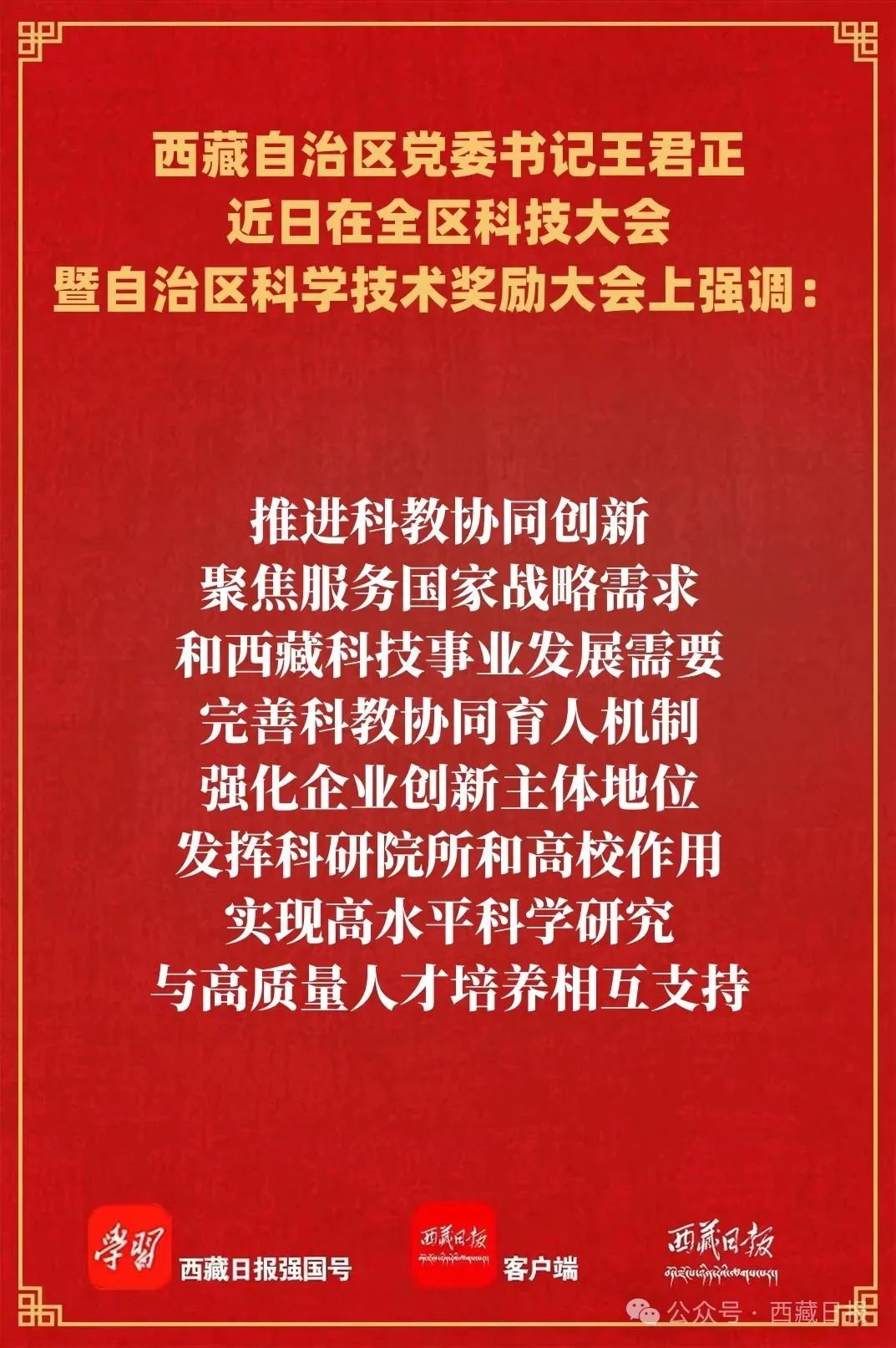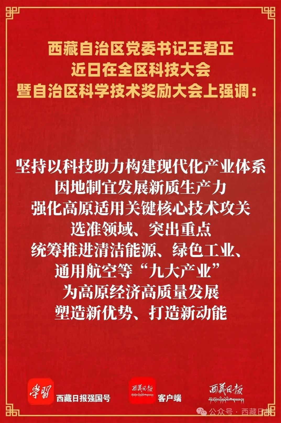 近日,全區(qū)科技大會暨自治區(qū)科學(xué)技術(shù)獎勵大會在拉薩召開,自治區(qū)黨委書記王君正出席并講話。他強調(diào),要深入貫徹落實習(xí)近平總書記關(guān)于科技創(chuàng)新、西藏工作的重要指示和新時代黨的治藏方略,加快推動科技事業(yè)發(fā)展,為社會主義現(xiàn)代化新西藏建設(shè)提供堅實科技支撐。