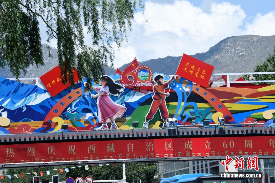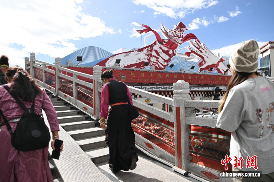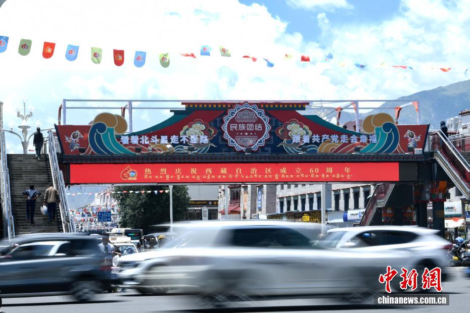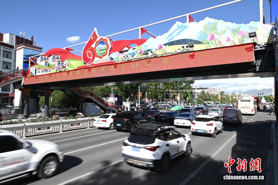 拉薩正以最美姿態(tài),迎接這一重要時(shí)刻。圖為裝扮一新的人行天橋。中新社記者 貢嘎來松 攝