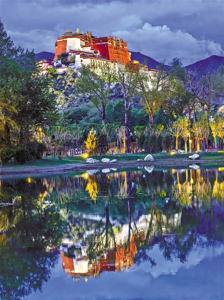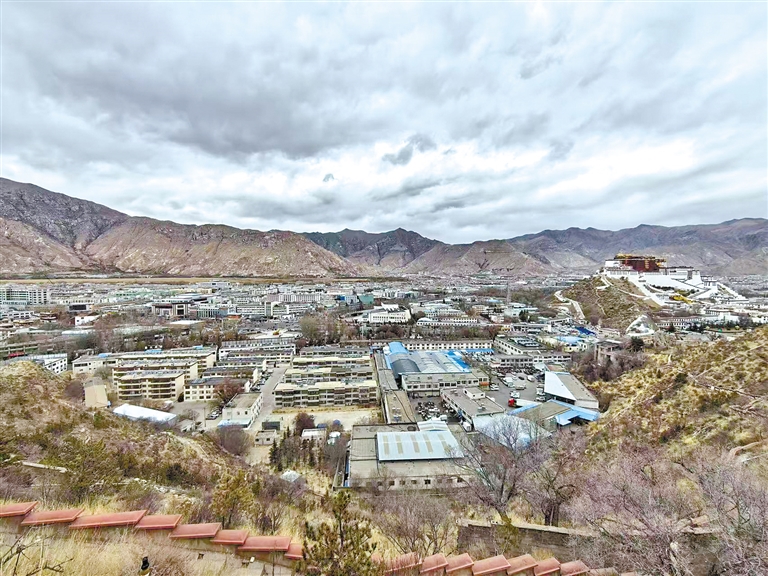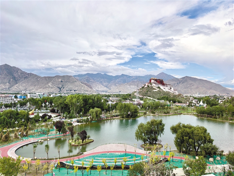站在藥王山觀景臺眺望,重獲新生的水系如綠色飄帶擁抱著布達拉宮。