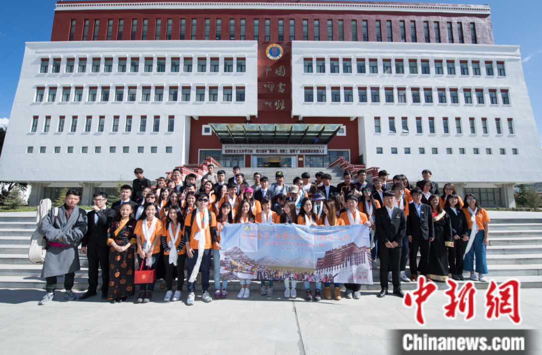 圖為2017年6月8日,香港青少年代表團與西藏大學(xué)學(xué)生代表在西藏大學(xué)圖書館前合影留念。中新社記者 何蓬磊 攝