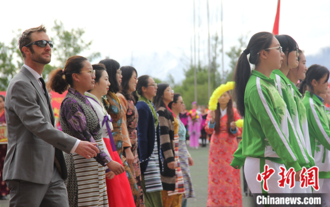 2017年5月11日,西藏大學(xué)舉行第二十八屆田徑運動會,數(shù)十名外籍留學(xué)生和外籍教師參加了開幕式。圖為開幕式中旅游與外語學(xué)院方隊 劉蔭 攝