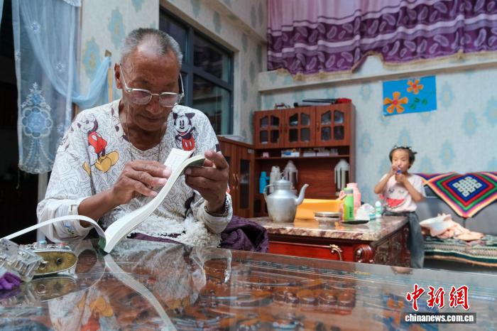 圖為8月12日,達(dá)瓦次仁在森布日的家中翻看藏歷,回憶在雙湖的經(jīng)歷,他的身后是他的外孫女。江飛波 攝