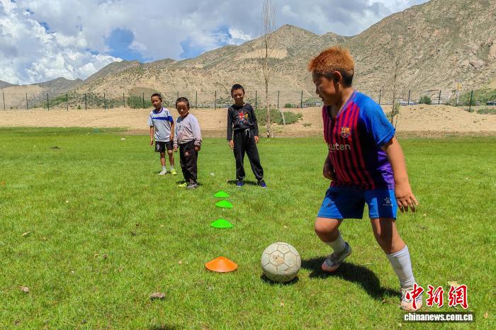 圖為8月12日,一群雙湖搬遷而來的兒童在森布日安置點(diǎn)一處草地上練習(xí)足球。江飛波 攝