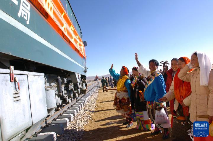 2004年10月10日,藏北群眾迎接火車抵達那曲。10月9日,青藏鐵路安多至那曲138公里鐵軌鋪設完成。10月10日,從安多出發(fā)的、西藏境內(nèi)第一列火車,于上午10時抵達當時的藏北重鎮(zhèn)——那曲鎮(zhèn)。