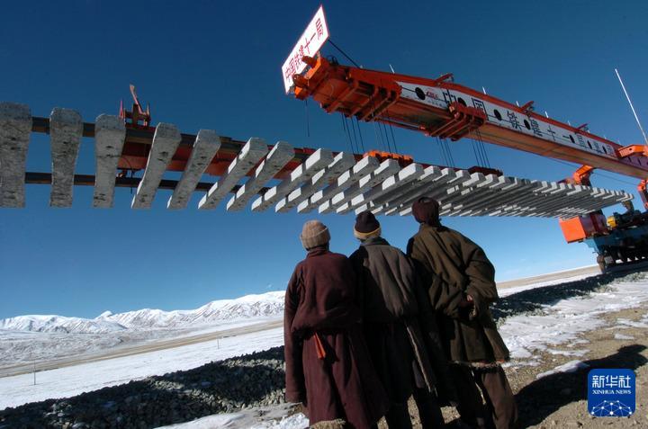 2004年12月5日,在西藏那曲境內(nèi),藏族群眾觀看青藏鐵路鐵軌鋪設過程。