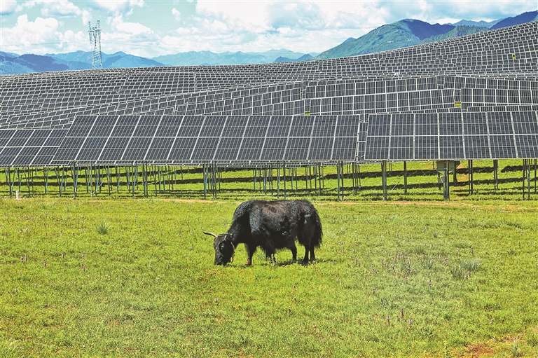 熱瓦鄉(xiāng)熱熱村是典型的牧業(yè)村,位于那曲市索縣的群山峻嶺之間。2023年12月,西藏開投集團投資建設的50MW牧光互補儲能項目在這里并網發(fā)電,遠遠望去像是山坡上的“藍色湖泊”。牧民們每天會趕著羊群來這里放牧,陽光透過光伏板的縫隙灑在草地上,羊群在陰涼下自由覓食。在光伏板的“庇護”下,不僅山地植被可以免受烈日大風的侵襲,還能對養(yǎng)殖的動物起到保護效果,在充分利用光能優(yōu)勢的同時,為鄉(xiāng)村振興注入新動能,實現企業(yè)和農牧民雙向受益。