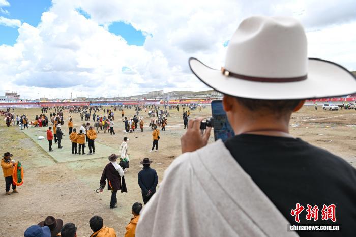 圖為當(dāng)?shù)孛癖娪檬謾C(jī)直播恰青賽馬節(jié)傳統(tǒng)大跑決賽。中新社記者 貢嘎來松 攝