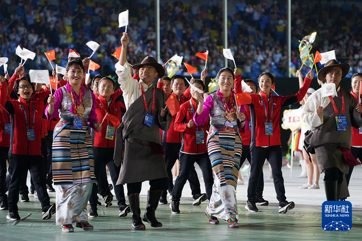第十四屆全運(yùn)會(huì)開幕式,西藏自治區(qū)體育代表團(tuán)在入場儀式上(2021年9月15日攝)。新華社記者 彭子洋 攝
